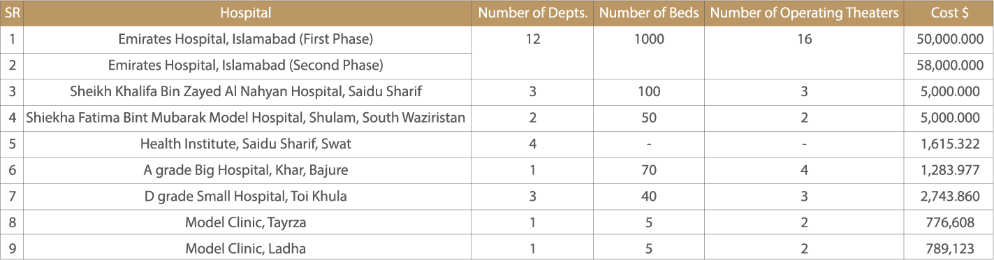 A Paramedic institute in Swat is also being built with separate hostels for boys and girls. Sheikha Fatima Bint Mubarak Model Hospital in Azam Warsak is another 40 bed hospital and an 80 bed hospital in Khaar is under construction as well.
