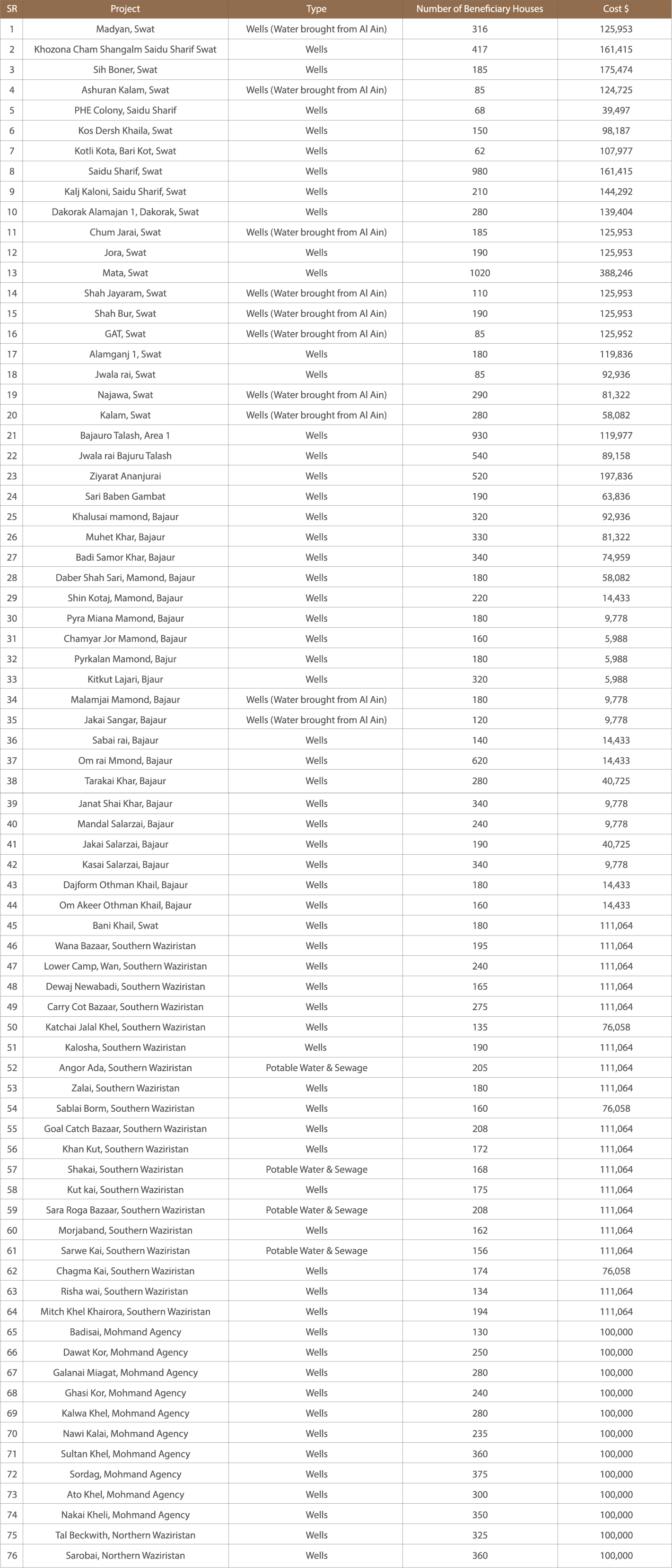 As part of the efforts made to make available potable water to the inhabitants and prevent diseases and epidemics, the UAE PAP adopted 76 projects, including 44 in Khyber Pakhtunkhwa, 20 in Southern Waziristan, 10 in Mohmand Agency and 2 in Northern Waziristan with a total cost of $6.673.000.